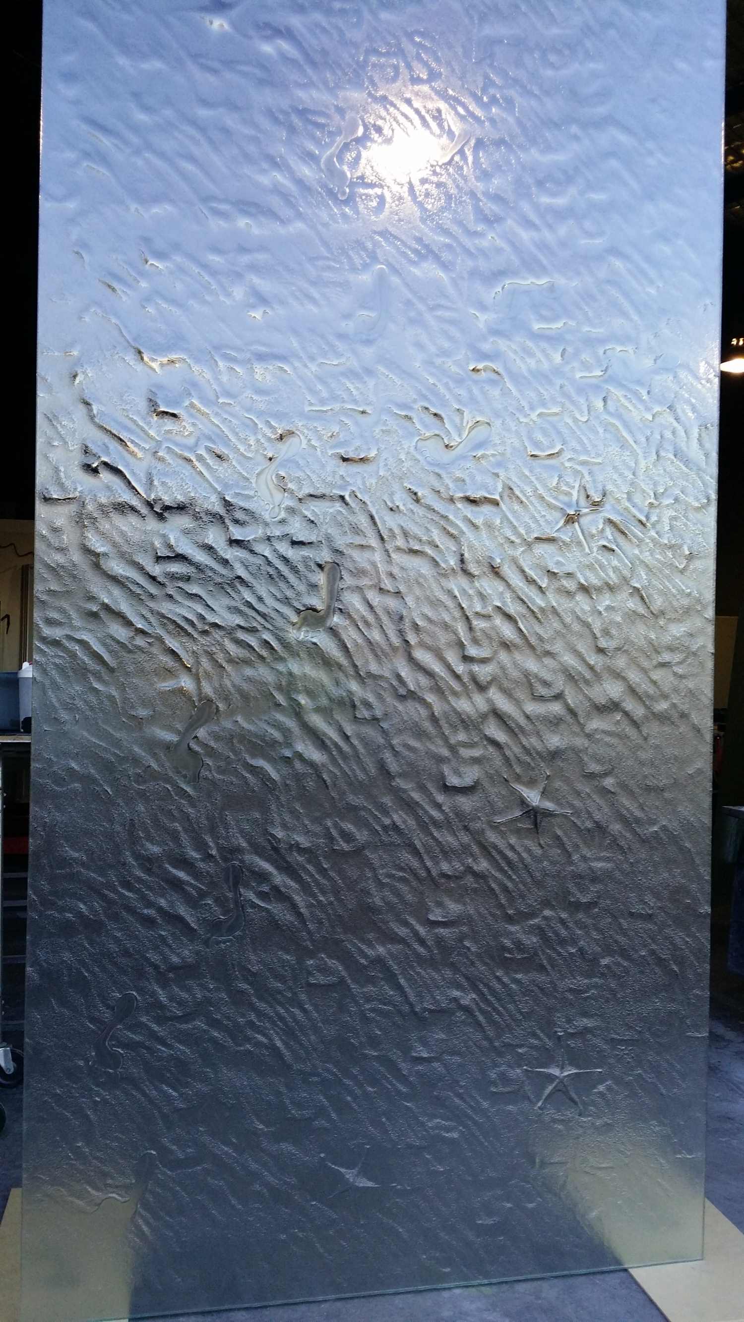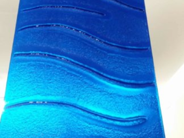 Slumped or textured glass is glass that has been fired in a kiln to take on the patterns, textures or moulds beneath it. The effect is truly beautiful with its rounded edges and tactile appearance. Using a heat proof paper we can also cut bold or somewhat intricate designs to create pictures, writing or borders giving the glass a 3D appearance.